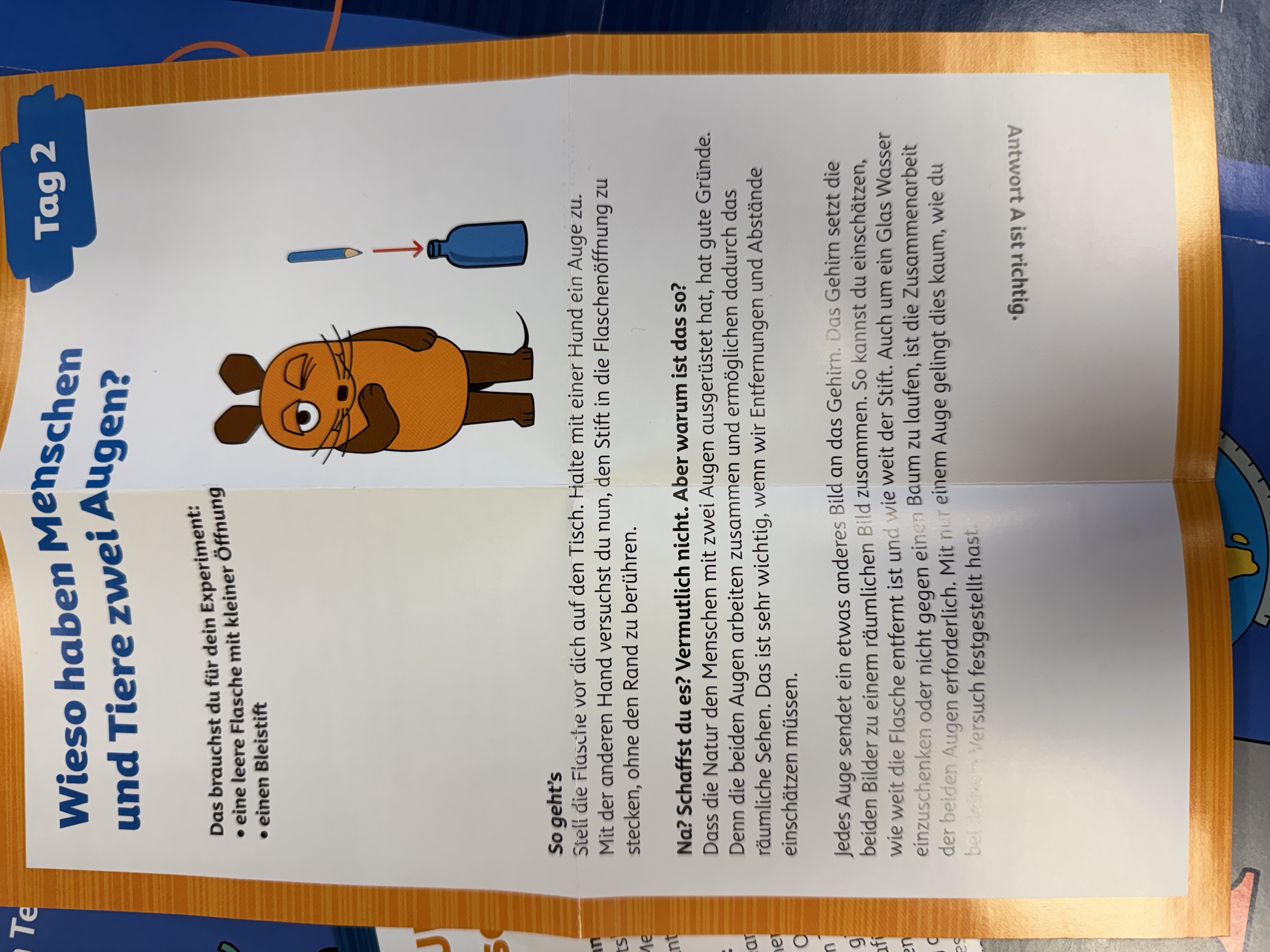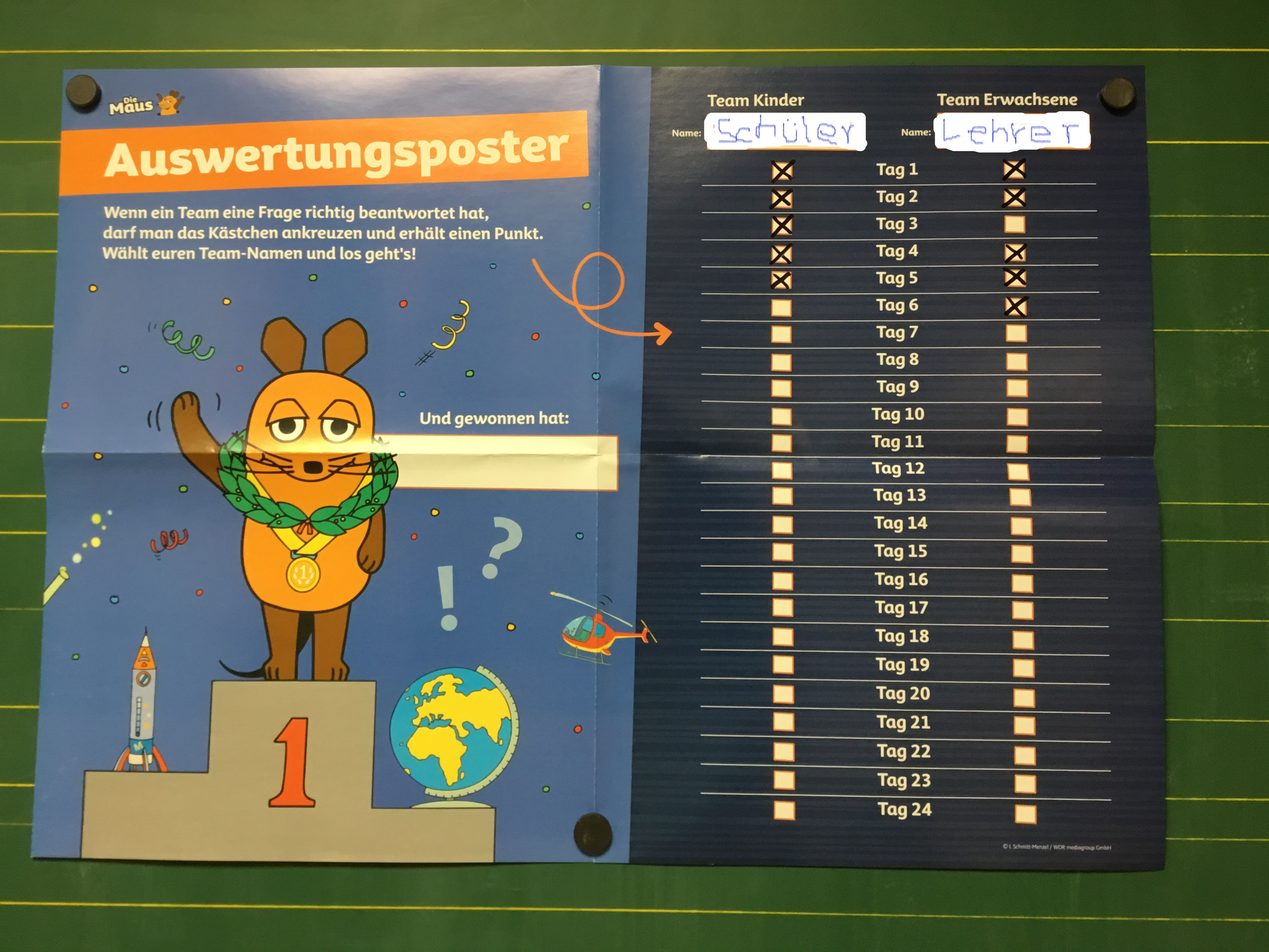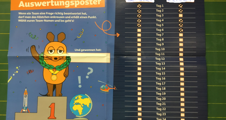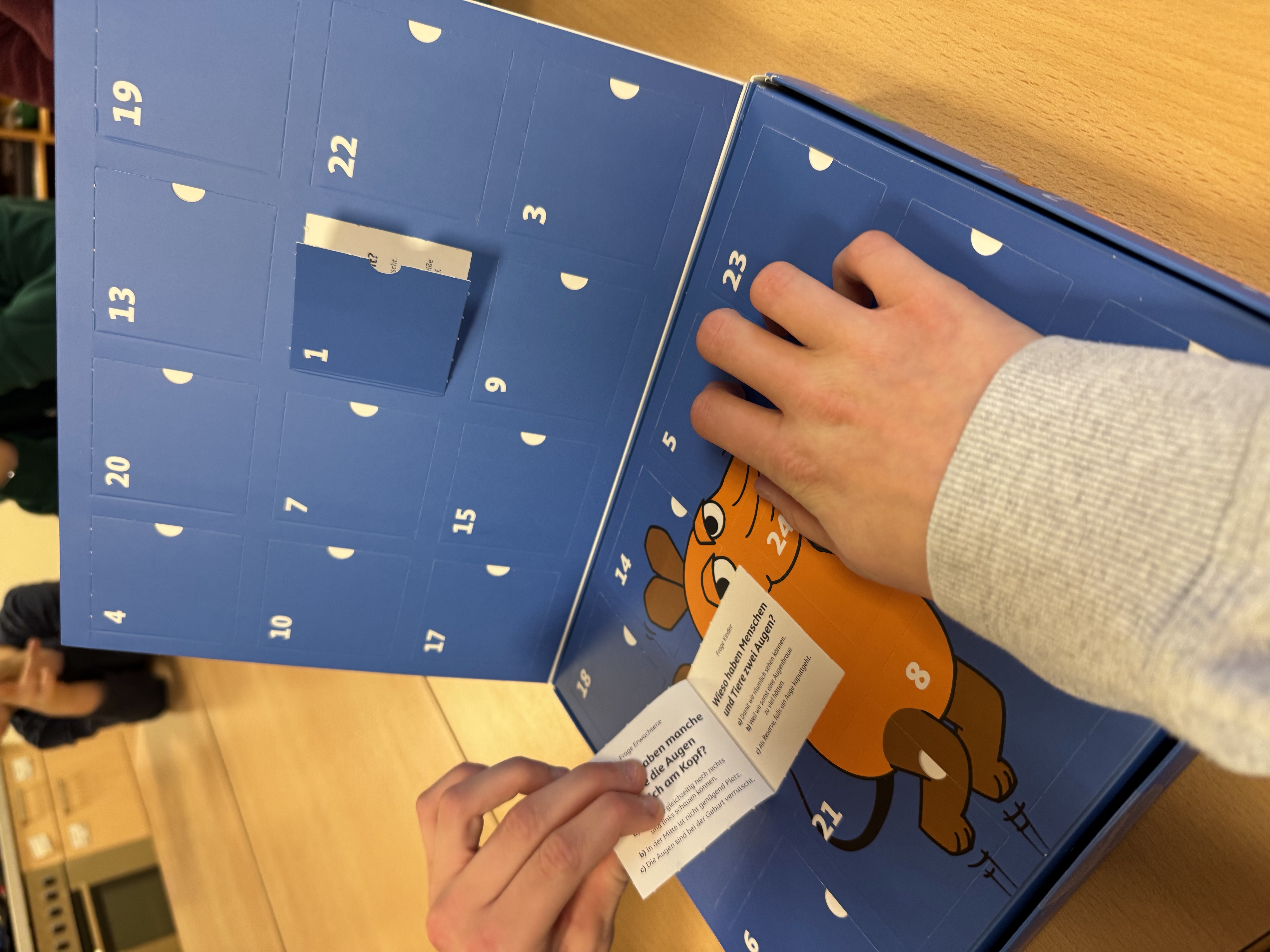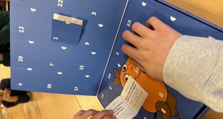 Die Klasse S6 hat auch in diesem Jahr wieder einen besonderen Adventskalender. Wer weiß mehr? Bist du schlauer als deine Lehrer? So heißt es jeden Morgen in der Tagesplanung. Hinter jedem Türchen versteckt sich eine Kinder- und eine Erwachsenen-Frage mit 2-3 Antwortmöglichkeiten. Warum tragen viele Menschen eine Brille? Warum heißt die Brille Brille? Gemeinsam entscheiden sich beide Gruppen für eine Antwort. In einem Briefumschlag mit der passenden Nummer befindet sich die Auflösung. Die Kinderfragen werden zudem mit kleinen spannenden Experimenten erklärt. Nach 6 Tagen herrscht Gleichstand, zur Zeit steht es 5:5. Es bleibt also spannend, wenn es jeden Morgen heißt: Wer weiß mehr?