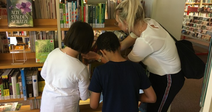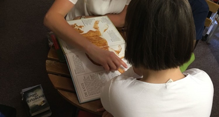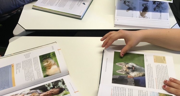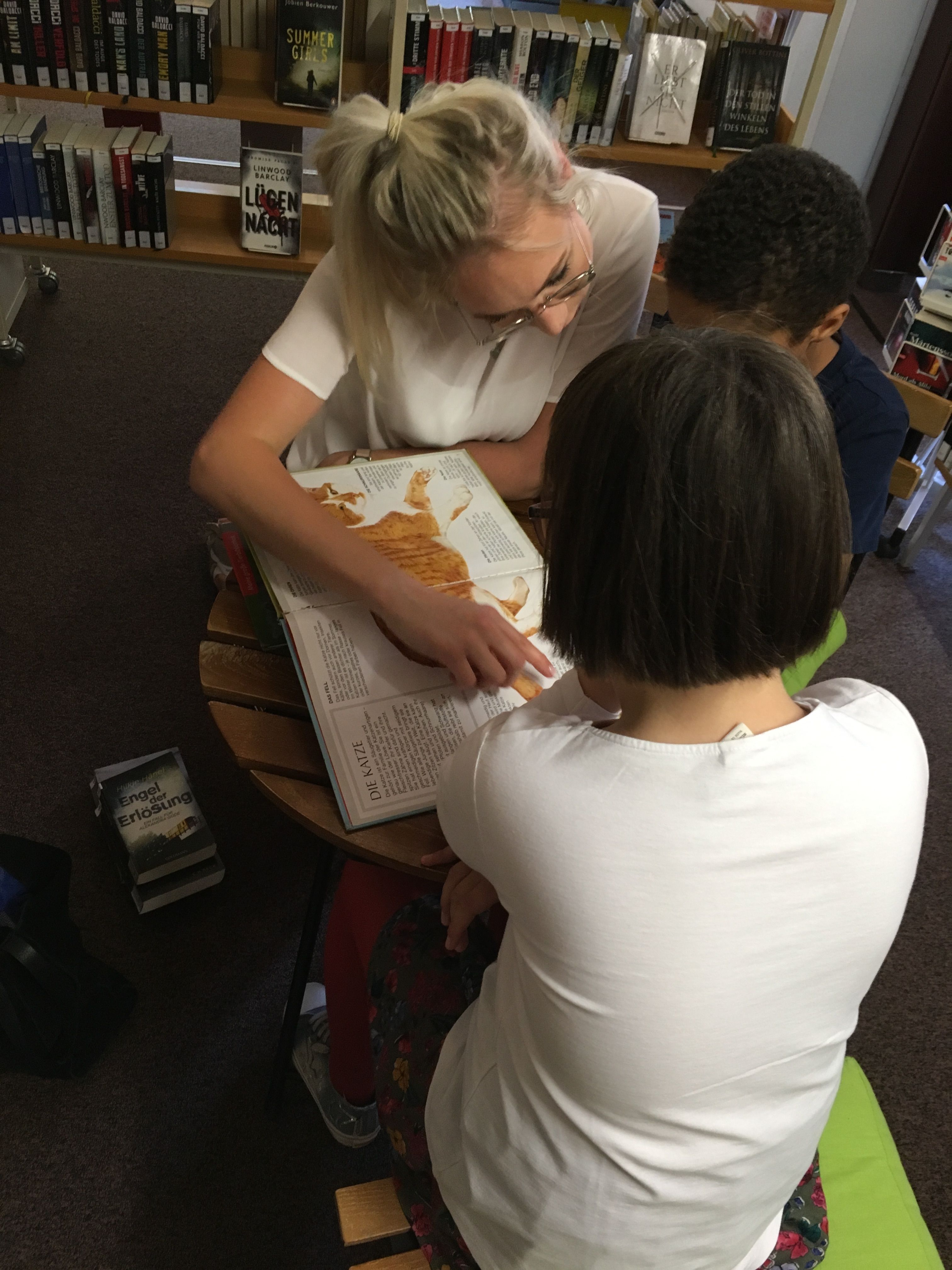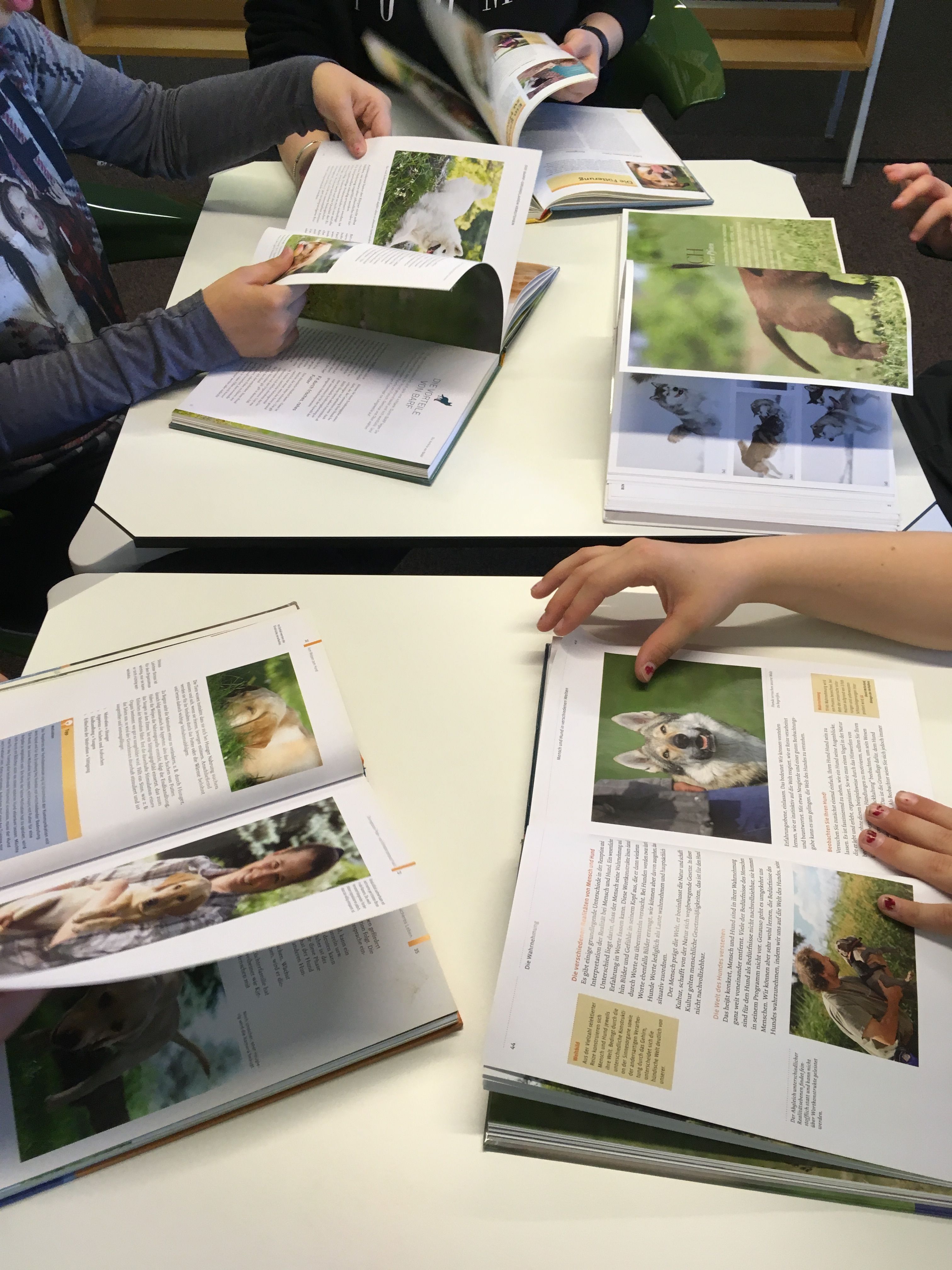 Die Klasse 5 und 6a behandeln zur Zeit das Thema Haustiere im Sachunterricht. In Kleingruppen erarbeiten sie die Themen "Der Hund", "Die Katze" und "Der Wellensittich". Am Ende der Unterrichtsreihe werden die Ergebnisse den anderen Gruppen in einem kleinen Referat vorgestellt. Zur Literaturrecherche ging es am heutigen Exkursionstag in die Bücherei. Jede Gruppe suchte Bücher zu "ihrem" Tier. Die Bücher wurden vor Ort gesichtet und dann ausgeliehen, um im Unterricht weiter mit ihnen zu arbeiten. Im Anschluss blieb noch Zeit, sich Bücher nach eigenem Interesse zu suchen und anzuschauen.