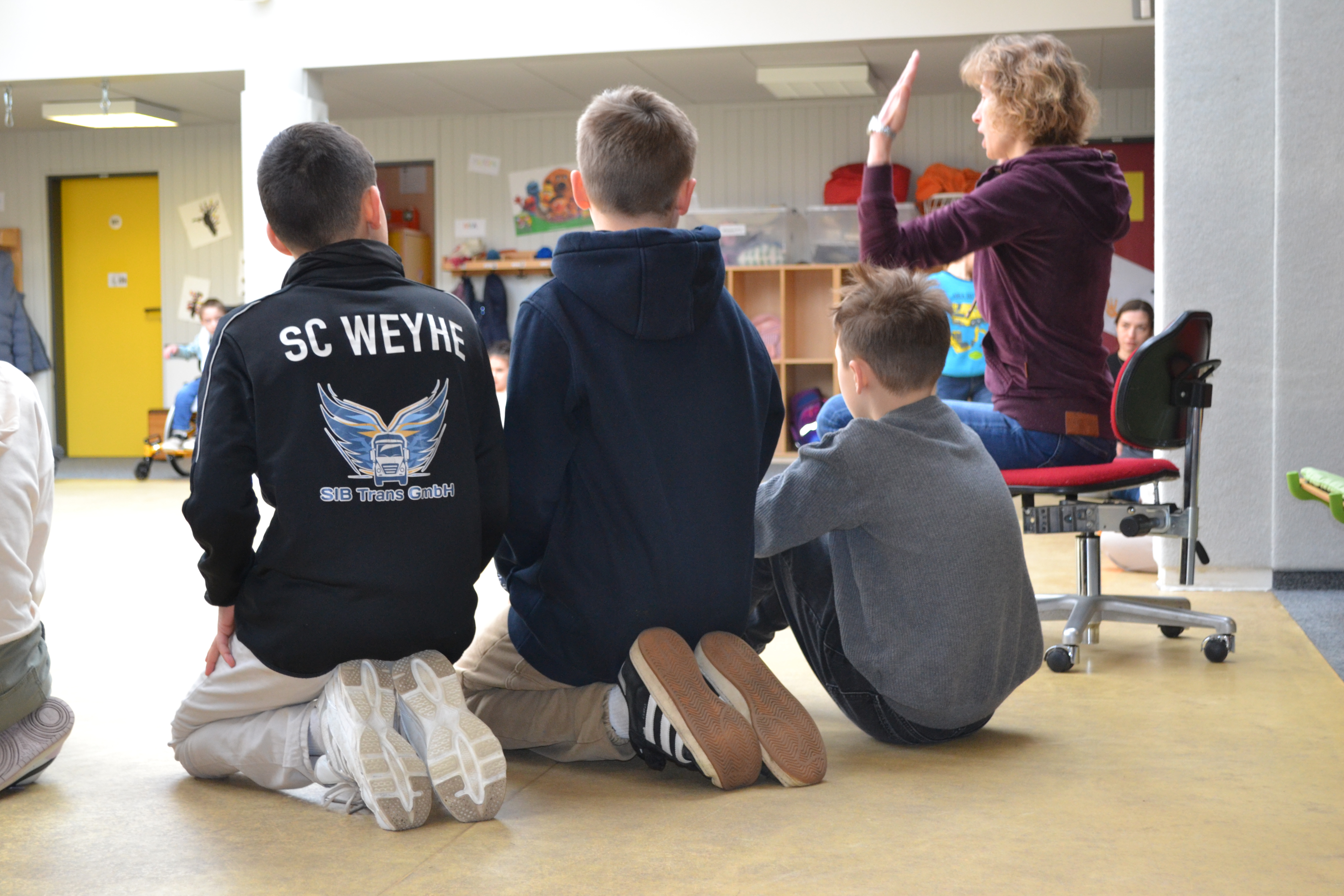 Am Donnerstag, den 20.02.25, hatte der Primarbereich der Erlenschule Besuch von einer Projektgruppe der vierten Klassen der Grundschule Sudweyhe. In ihrem Projekt geht es um Frieden und Gerechtigkeit sowie selbstständiges Arbeiten. Die Schüler interessierten sich für den Unterricht an der Erlenschule und ein Miteinander mit unseren Schülern. In der Zeit von 9:00Uhr bis 11:00 Uhr trafen wir uns. Nach einer Begrüßungsrunde und einem Kennlernspiel gab es ein gemeinsames Frühstück. Dazu verteilten sich die Grundschüler in alle Primarklassen der Erlenschule. Zum Toben und Luft schnappen nutzten wir eine „Flitze-Pause“ auf dem Spielplatz. Anschließend ging es gut gestärkt im Atrium weiter. Die Schüler aus Sudweyhe hatten verschiedene Ideen und Bastelmaterialien mitgebracht. Bei den Bewegungsspielen wie z.B. „Der Dirigent“, „Obstsalat“ und „Pferderennen“ hatten alle viel Spaß. Es war ein sehr lustiger, gelungener Vormittag mit vielen interessanten Erfahrungen.