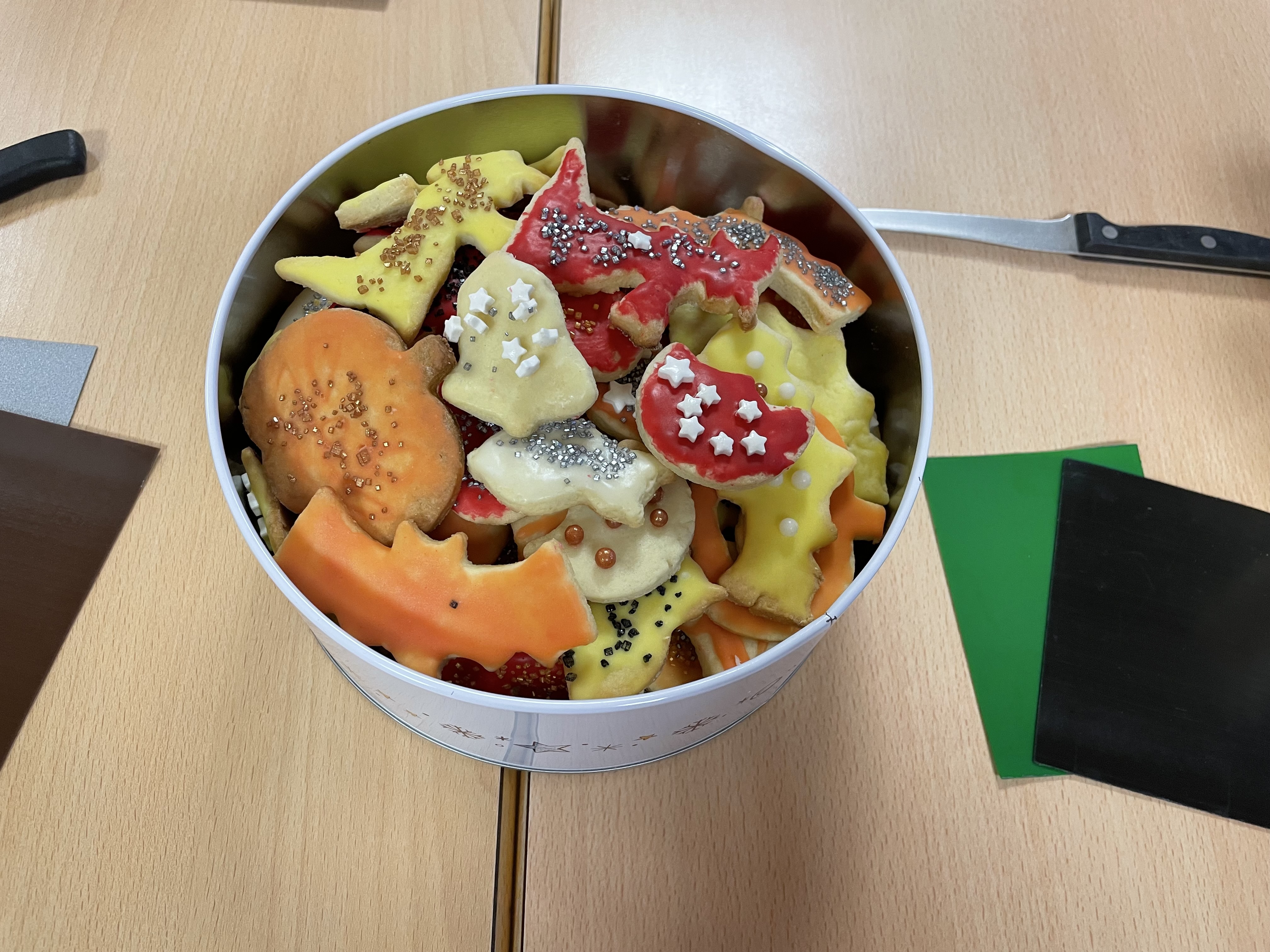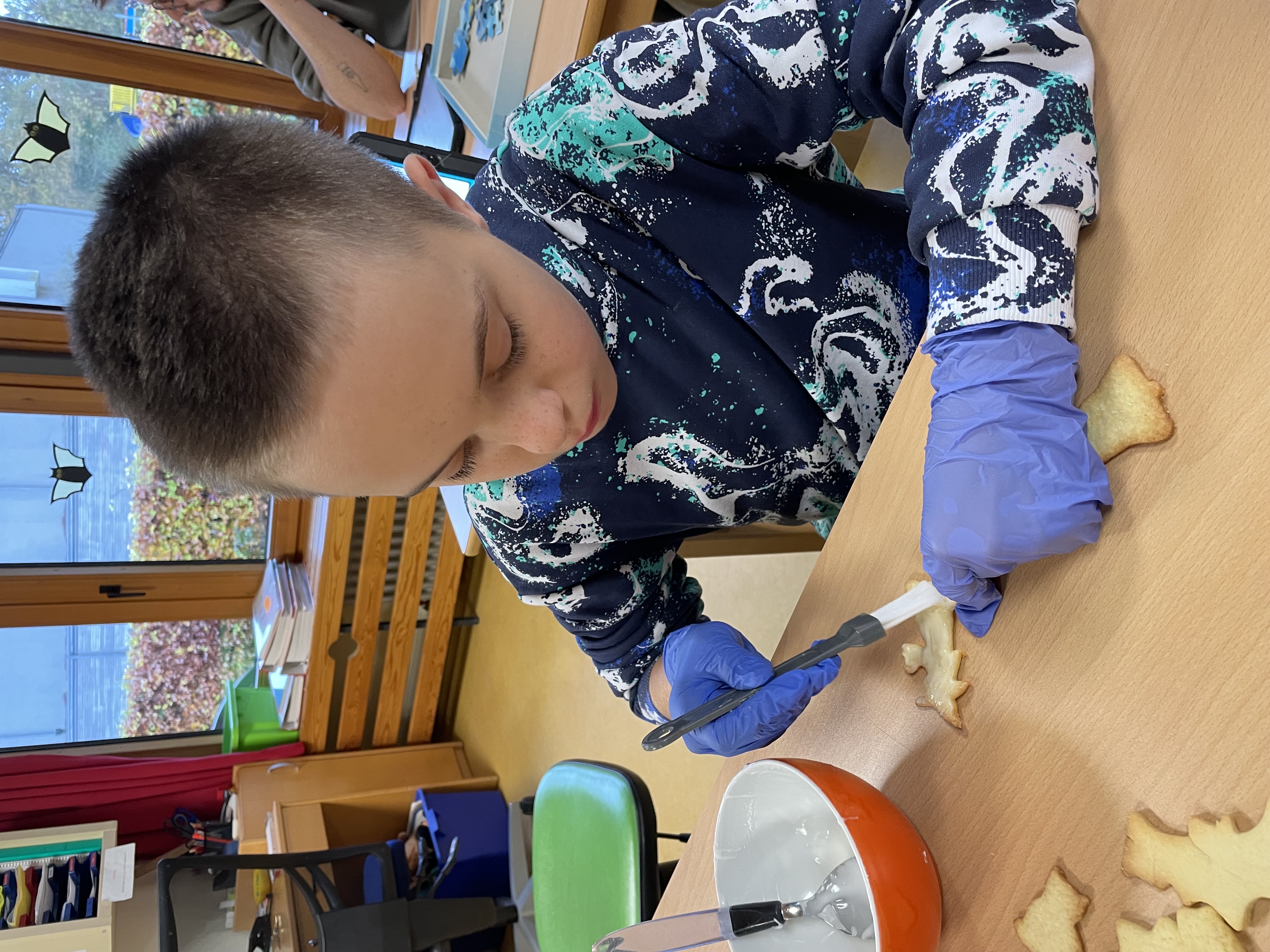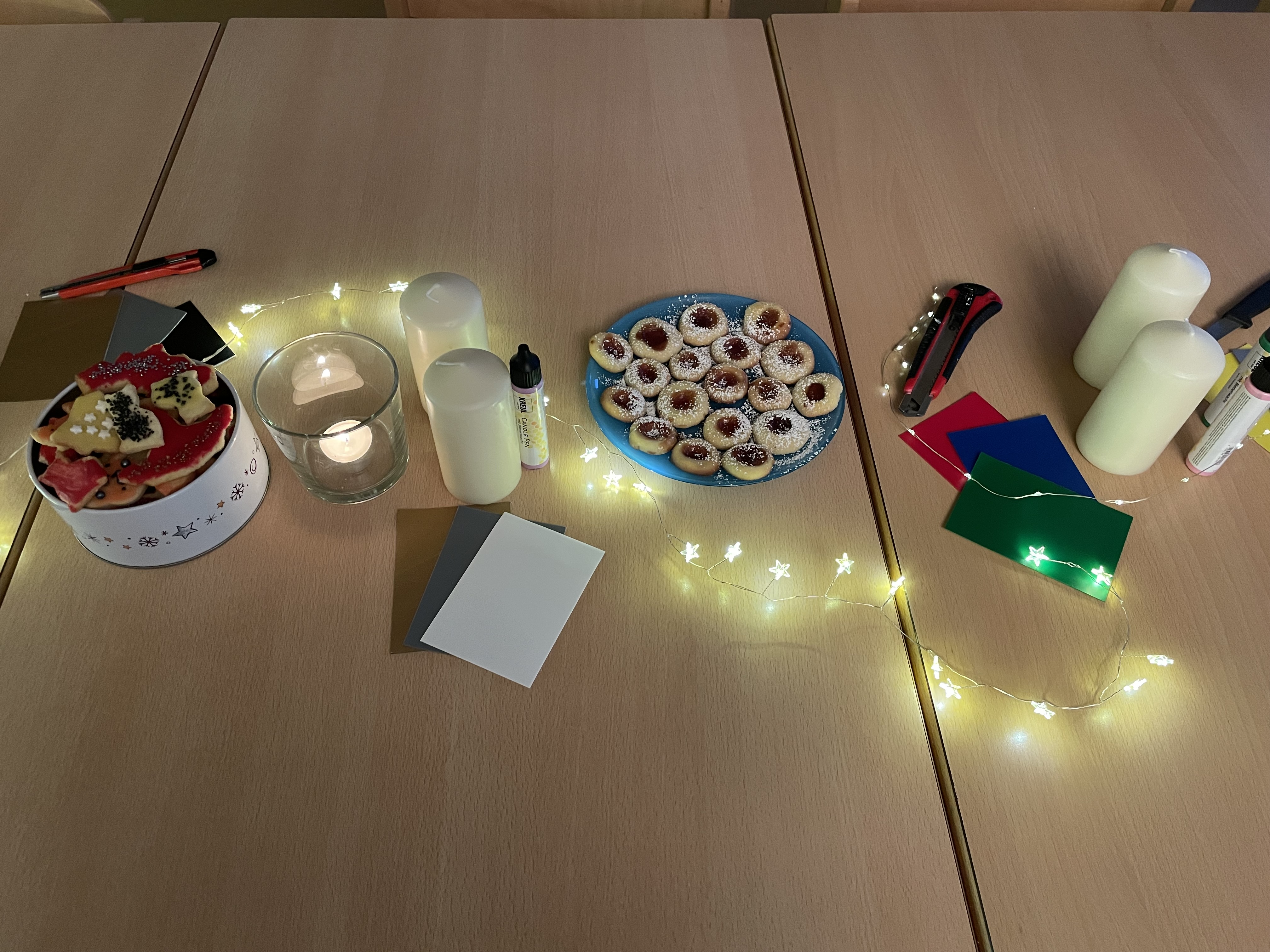 Am Mittwoch, den 13.11.2024 hat die Klasse S6 zu einem Elternnachmittag eingeladen. Im Vorfeld wurden gemeinsam herbstliche Kekse gebacken und verziert und der Klassenraum stimmungsvoll hergerichtet. Bei Keksen und Punsch saßen Eltern, Schüler*innen, Geschwister und Lehrkräfte gemütlich beisammen und verzierten passend zur dunklen Jahreszeit gemeinsam dicke Kerzen. Während die Erwachsenen sich danach weiter unterhielten, waren die Schüler*innen mit mitgebrachten Taschenlampen in der dunklen Schule und auf dem Außengelände unterwegs. Viel zu schnell waren die 2 Stunden um und es hieß ab nach Hause. Für alle Beteiligten ein wirklich schöner Nachmittag.