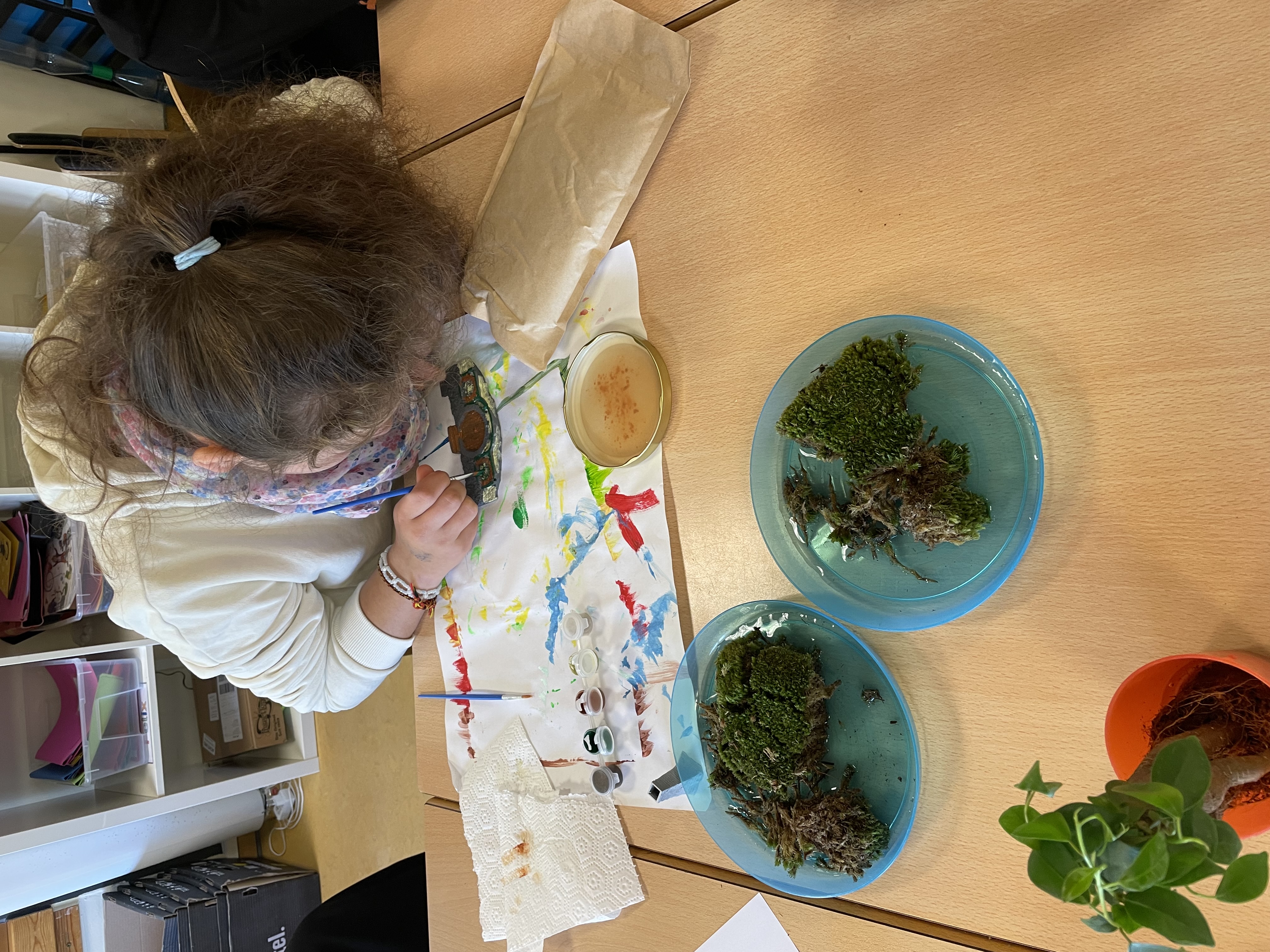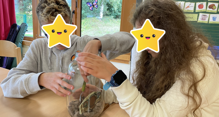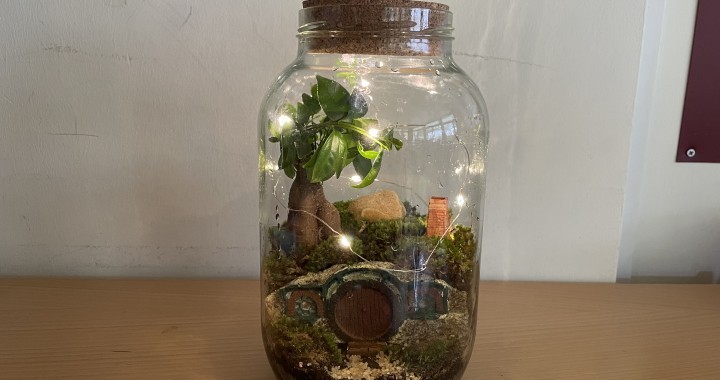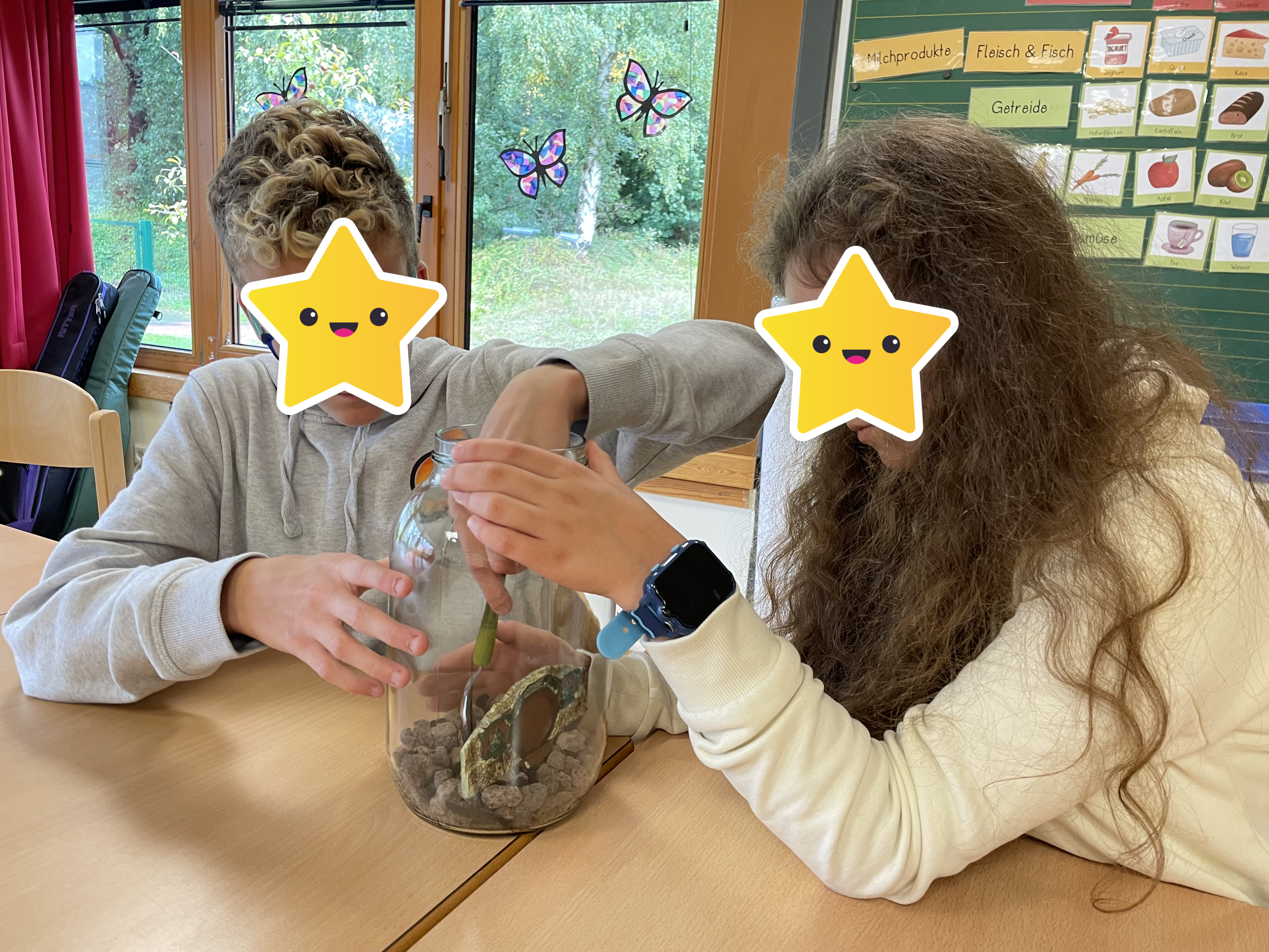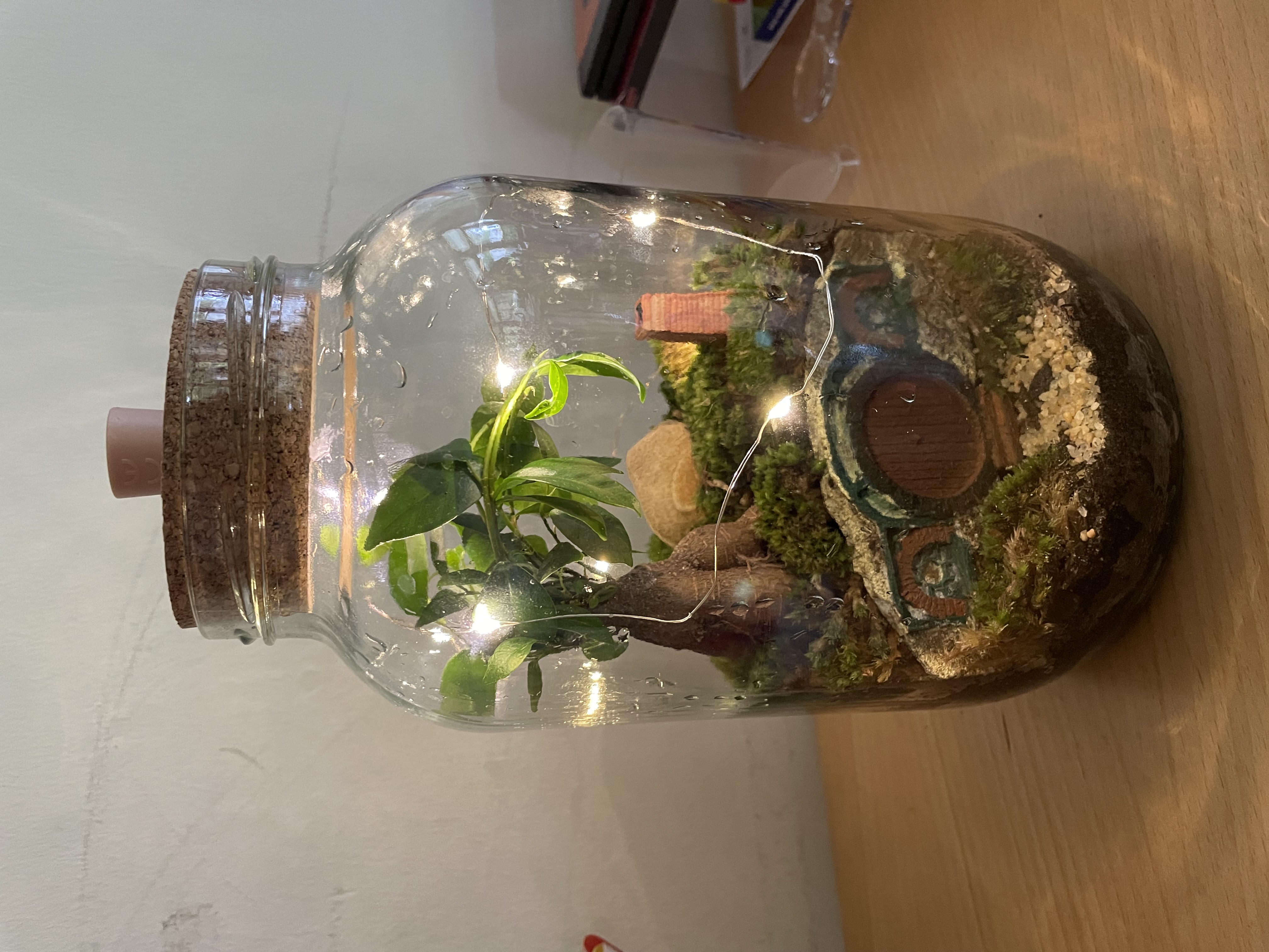 Gemeinsam haben wir uns das Set „Halbling-Höhle im Flaschengarten“ ausgesucht. Zunächst wurde die Halbling-Höhle mit den mitgelieferten Farben bemalt und dann der Flaschengarten bepflanzt. Nun können die Schüler*innen den Kreislauf des Wassers beobachten und nachvollziehen und den Pflanzen beim Wachsen zuschauen. Stimmungsvoll beleuchtet ist der Flaschengarten zudem ein Blickfang und Schmuckstück in unserem Klassenraum.
