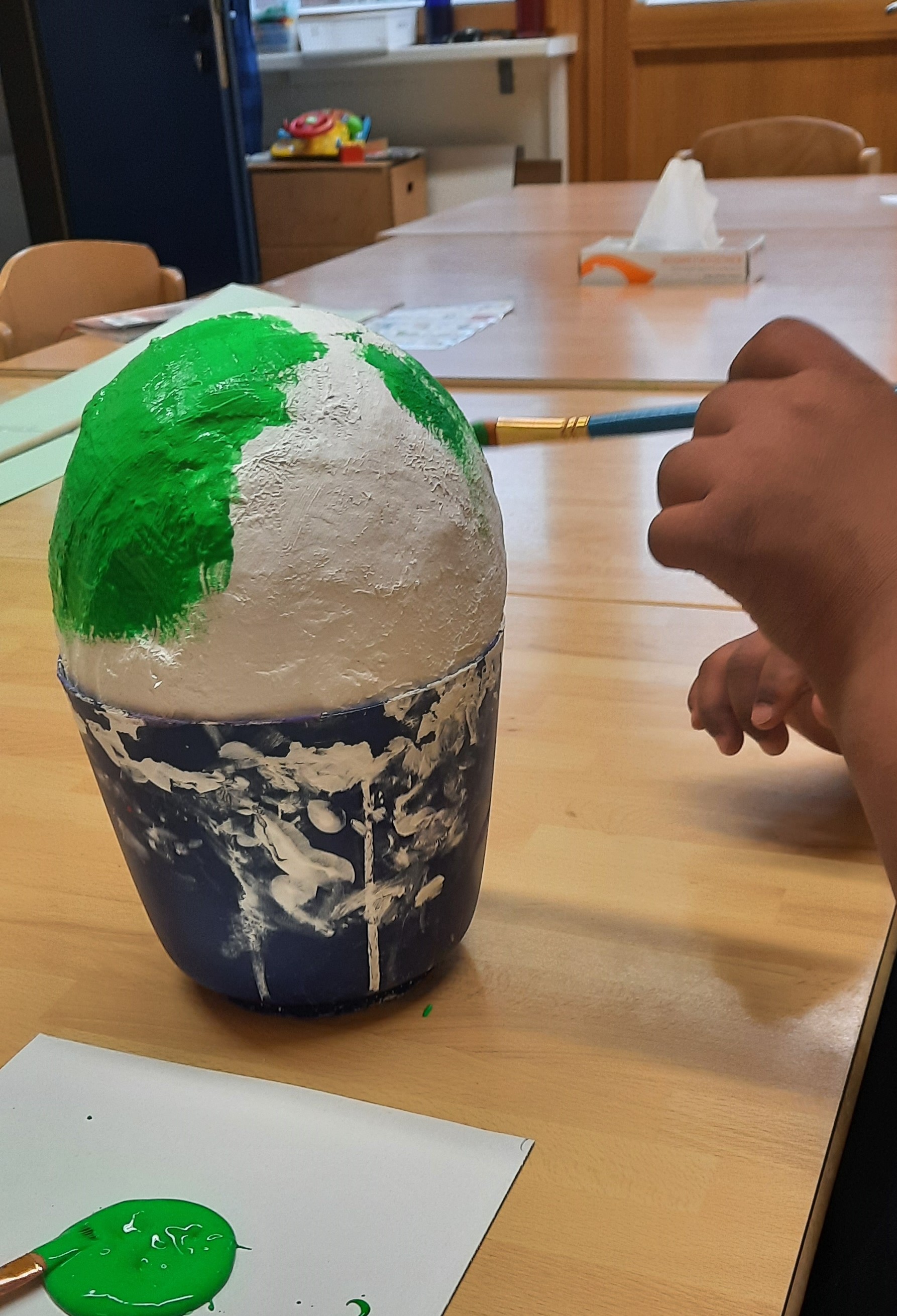 Zwei Schülerinnen der Klasse S1 haben im Kunstunterricht mit Luftballons und Gipsbinden gearbeitet. Vorab konnten sich die beiden entscheiden, ob daraus ein Vogel oder eine Fantasie-Figur entstehen sollte. Nach einer kurzen Erklärung und Demonstration, wie mit Gips gearbeitet wird, konnte es losgehen. Beide waren sehr engagiert und ausdauernd bei der Arbeit. Über einen Zeitraum von drei Wochen sind so zwei tolle Gips-Ballons entstanden. Dazu gehörte neben dem Gipsen selbst das kreative Anmalen und Besprühen mit Klarlack, damit sie auch weitestgehend wetterfest sind. Vielleicht hat ja einer der beiden einen tollen Platz im Garten gefunden und wirkt dort mit seinen tollen Farben als Hingucker.
