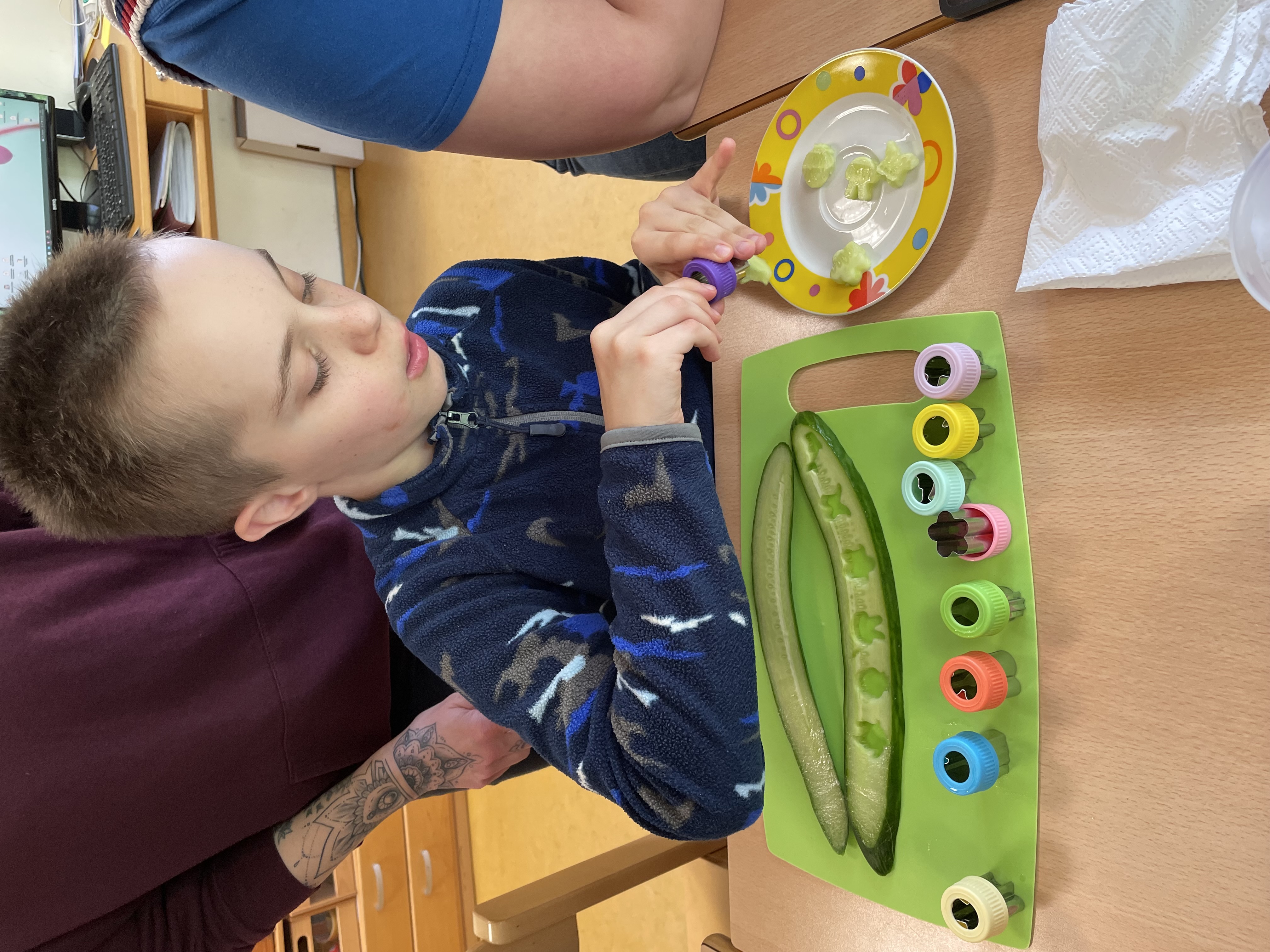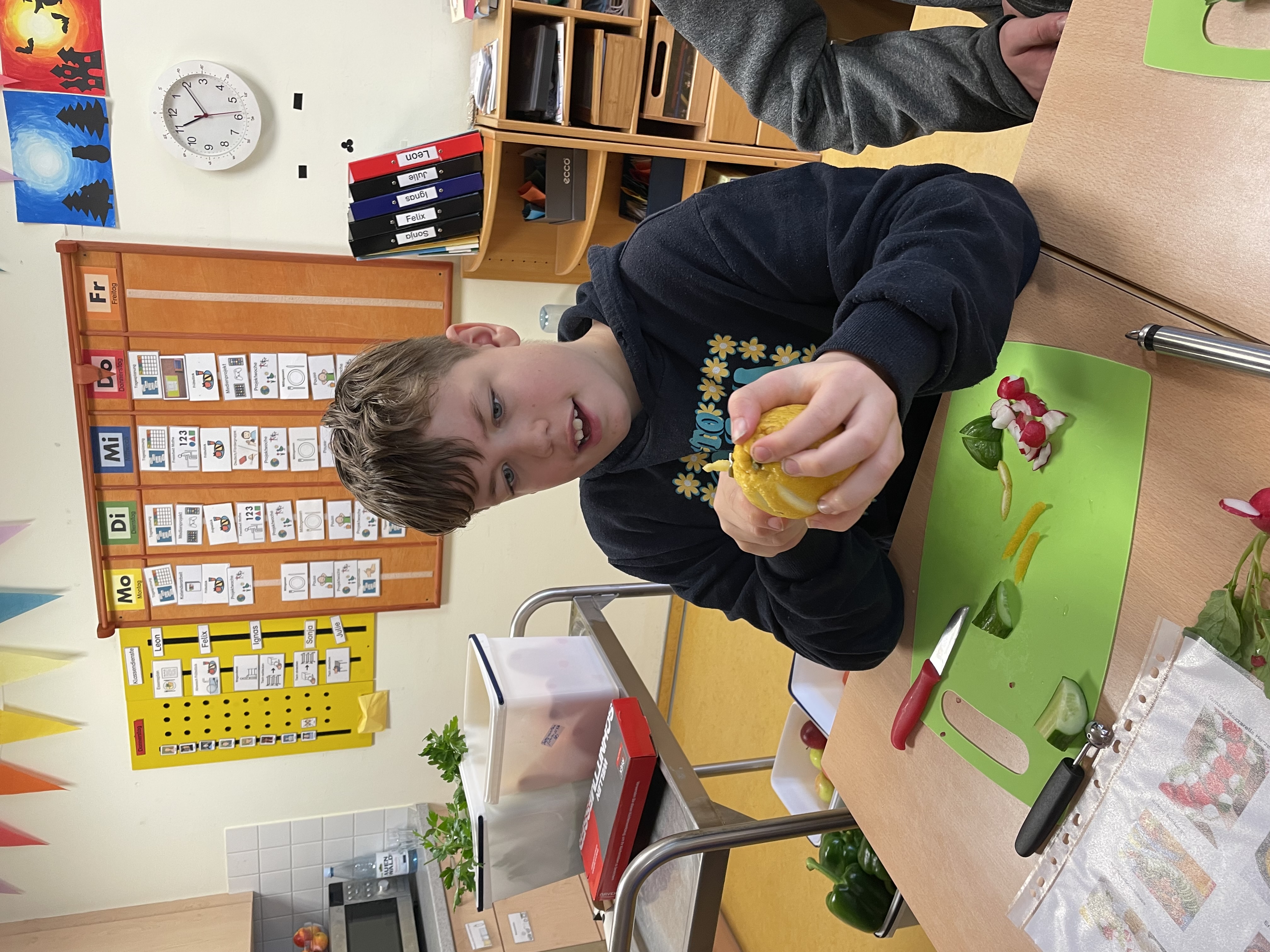Vom 15.-19.04.2024 hat Heike Melchers, die Köchin der Erlenschule, eine Projektwoche mit den Schüler/innen der Klasse S5 durchgeführt. Darauf hatten die Schüler/innen sich schon seit Wochen gefreut. Neben verschiedenen Gemüseschnitzereien haben die Schüler/innen die große Küche näher kennengelernt und dort bei der Vorbereitung des Mittagessen geholfen. Alle waren mit Feuereifer dabei und haben viel über die Verarbeitung von Gemüse gelernt. Vielen Dank an Frau Melchers für diese tolle Woche!