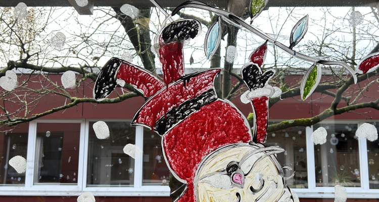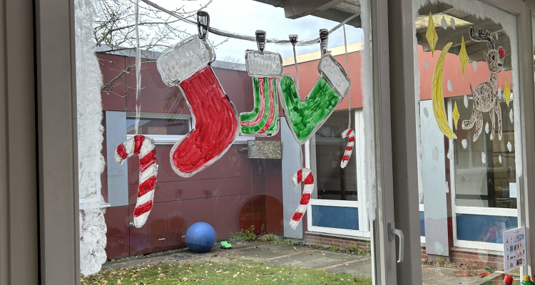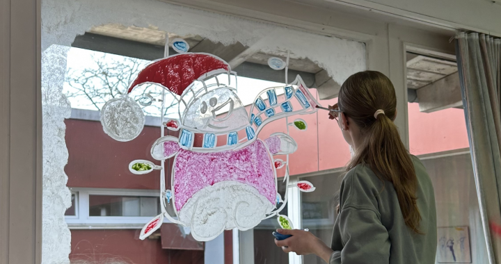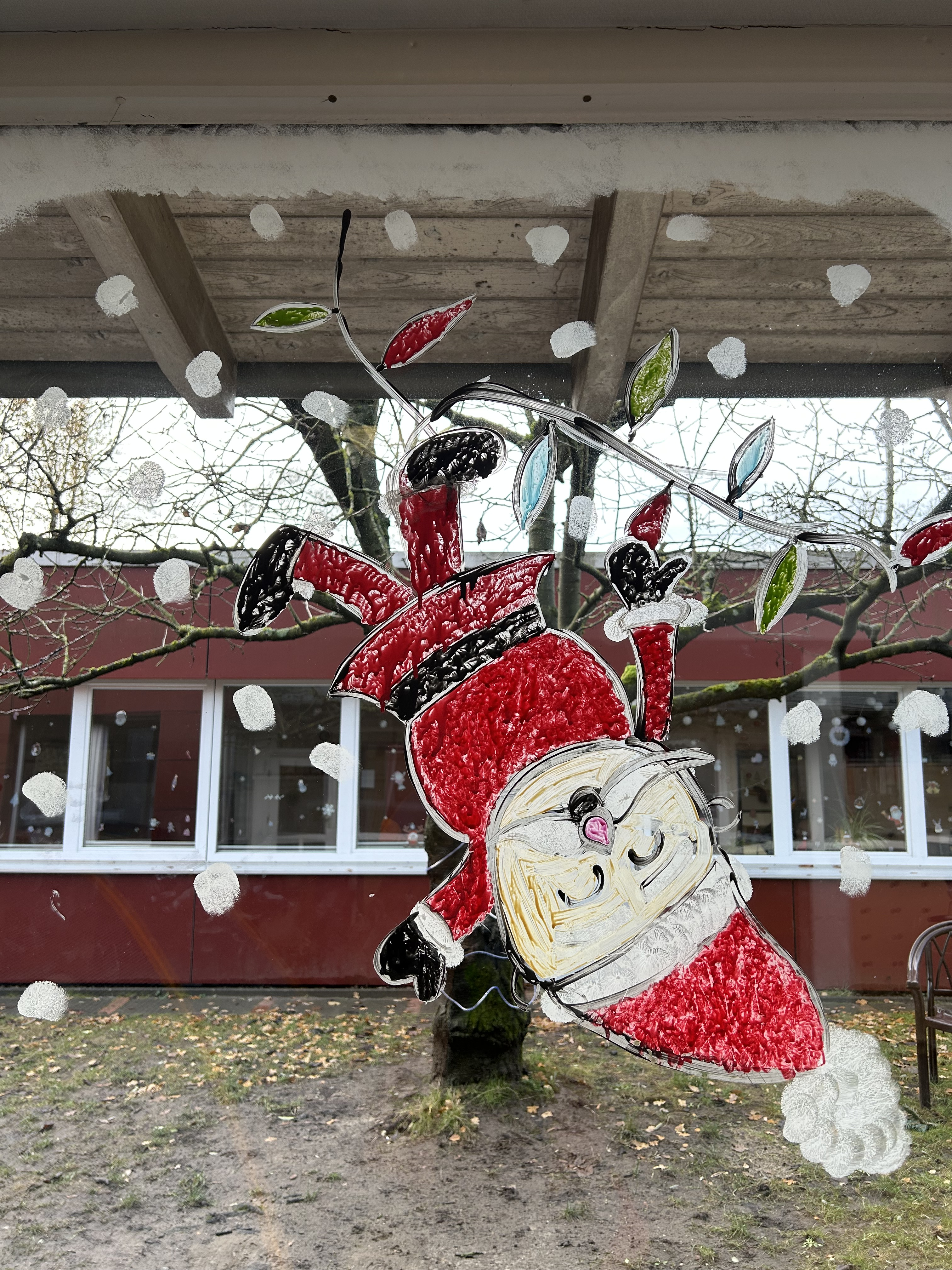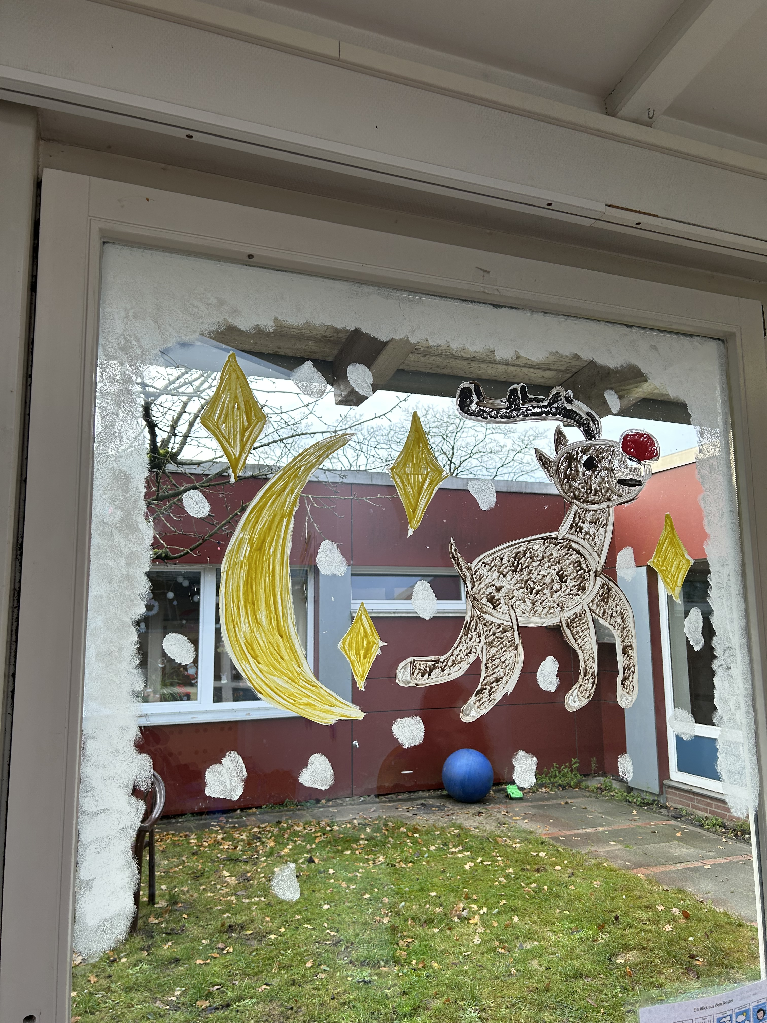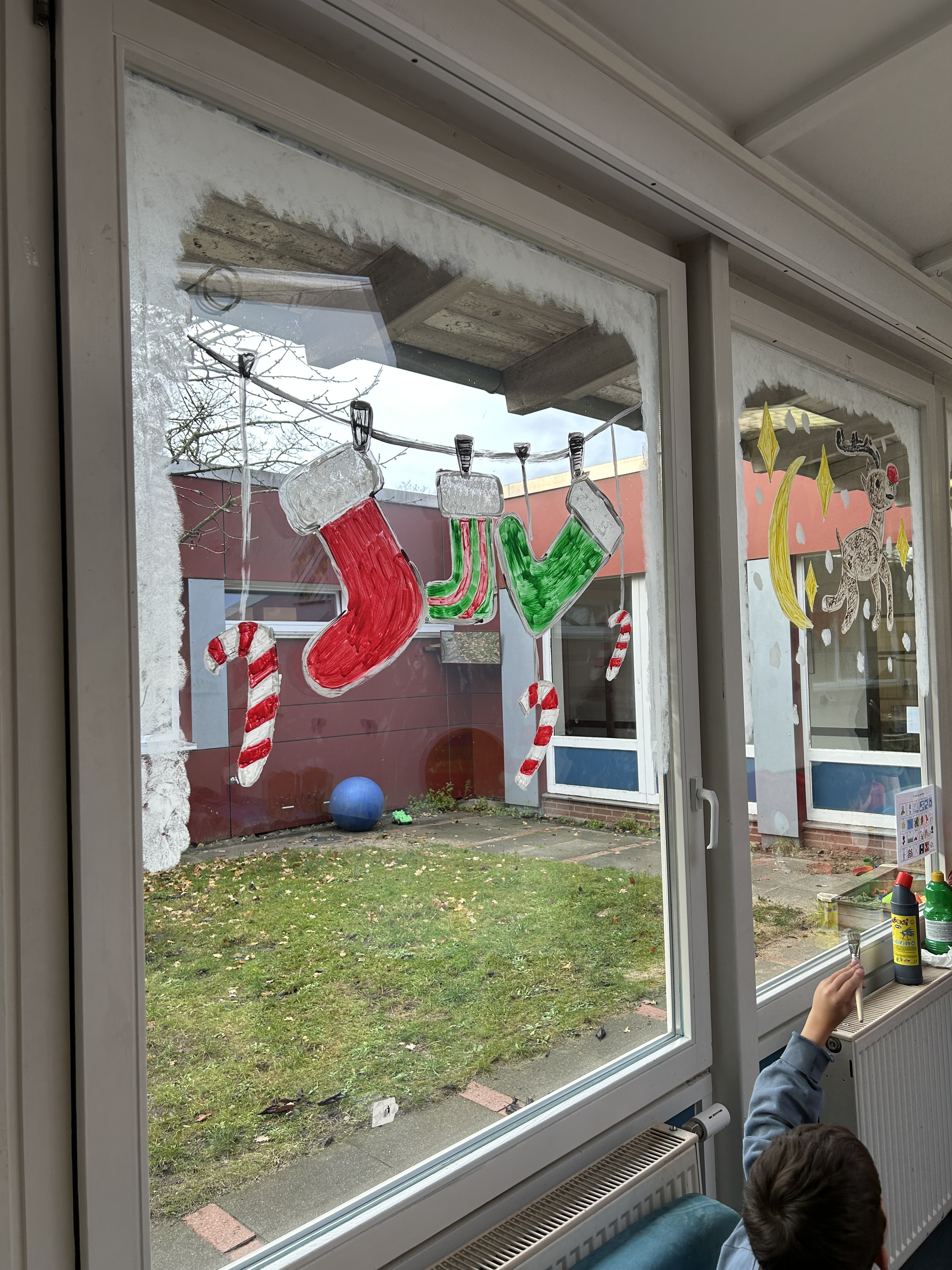Die Praktikantin für Gesundheit und Pflege und die FSJlerin haben gemeinsam mit den Schülern der Klasse P1 ein tolles Weihnachtsbild an die Fenster der Pausenhalle gemalt.