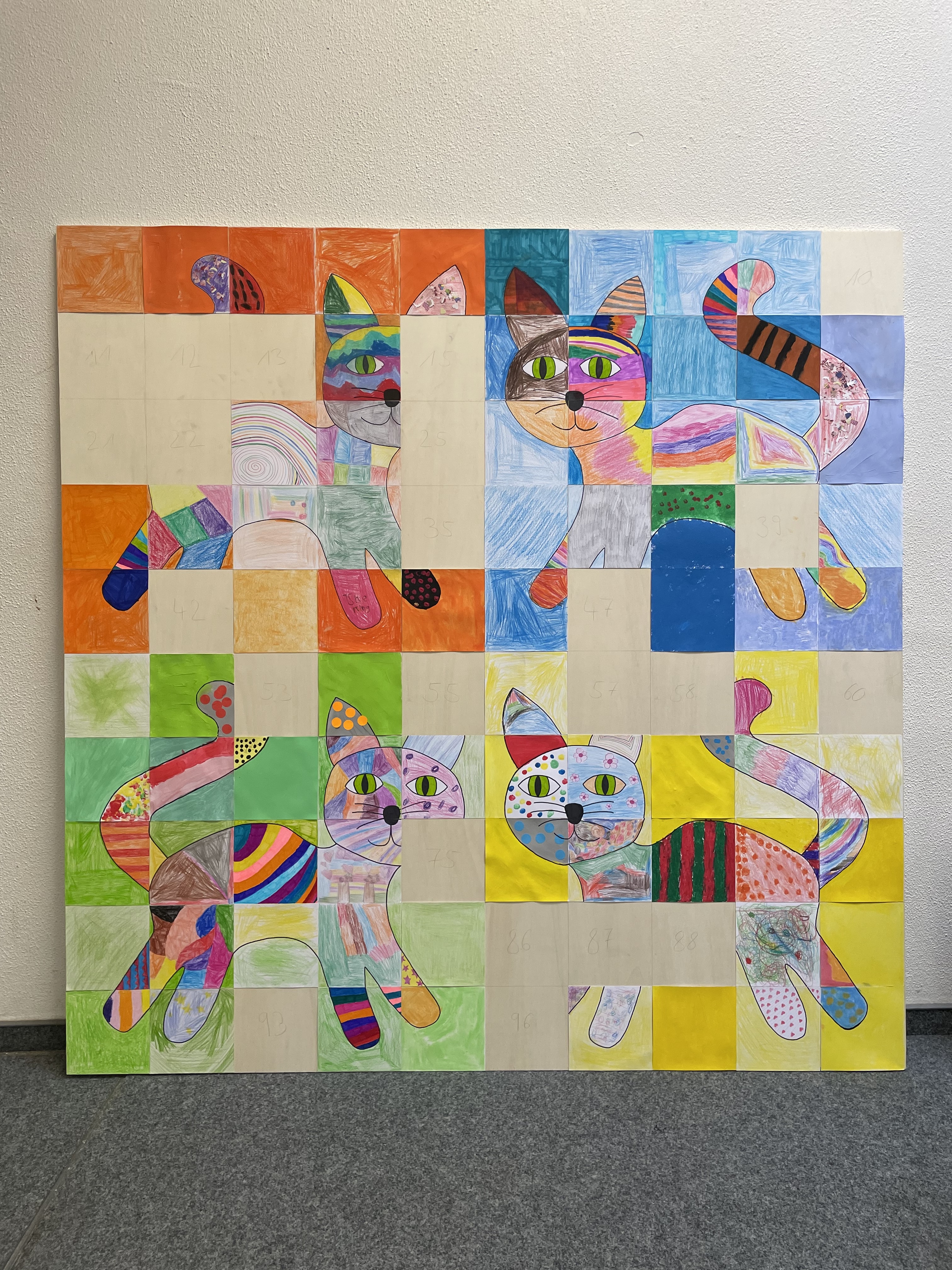 Corona hat uns fest im Griff. Während wir zu Beginn des Schuljahres zumindest noch in Kohorten und mit ganzen Klassen arbeiten durften, ist seit Januar 2021 nur noch die Beschulung in halben Klassen (max. 4 Schüler/innen) ohne Kooperation mit anderen Klassen möglich. Wie gelingt es in diesen Zeiten vielleicht doch zumindest ein Stück weit ein Gefühl von Gemeinschaft zu erzeugen? Diese Frage führte zu der Idee eines Gemeinschaft-Kunstwerkes, an dem sich alle Schüler/innen der Erlenschule beteiligt haben. Aus 100 Einzelteilen besteht das Kunstwerk, die jeweilige Hintergrundfarbe war vorgegeben, der Rest konnte frei gestaltet werden. Nach und nach kamen immer mehr Teile hinzu und allen machte es viel Freude dem Kunstwerk beim Wachsen zuzusehen. Das fertige Ergebnis begeistert Groß und Klein und alle sind stolz auf das gemeinsame Kunstwerk.